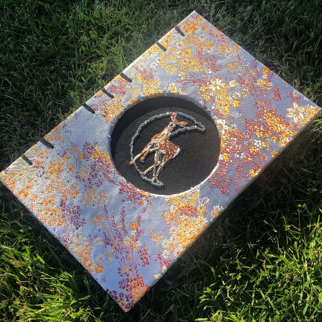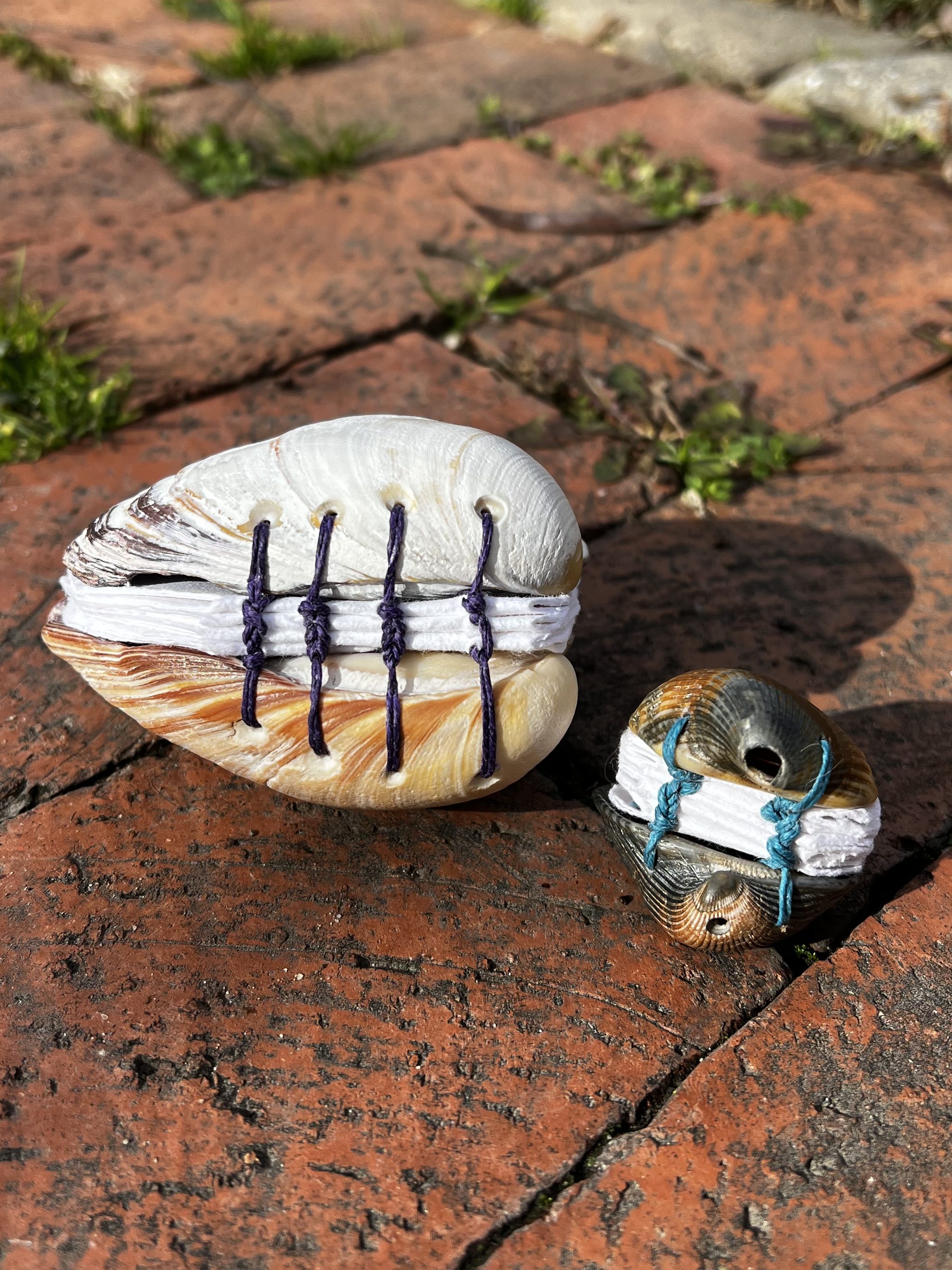 wherever possible, my books are made of recycled materials (including paper that I make myself!) my current favorite binding methods are coptic stitch and stab stitch.